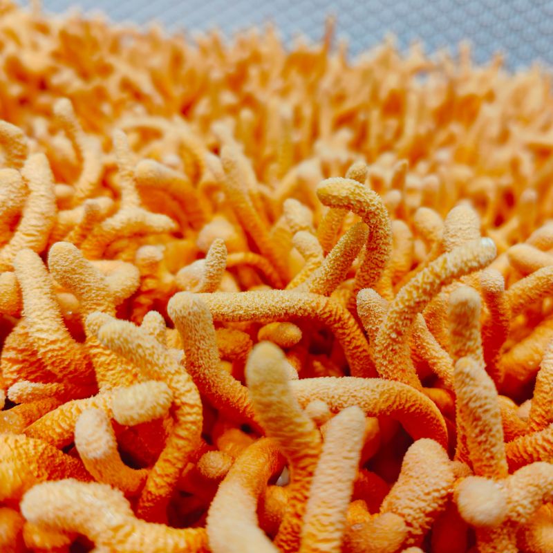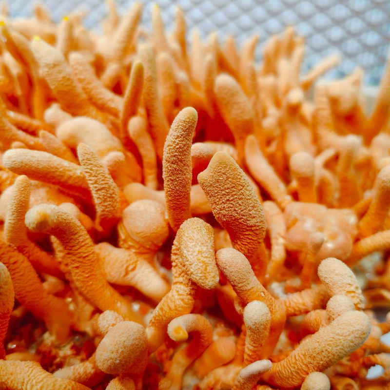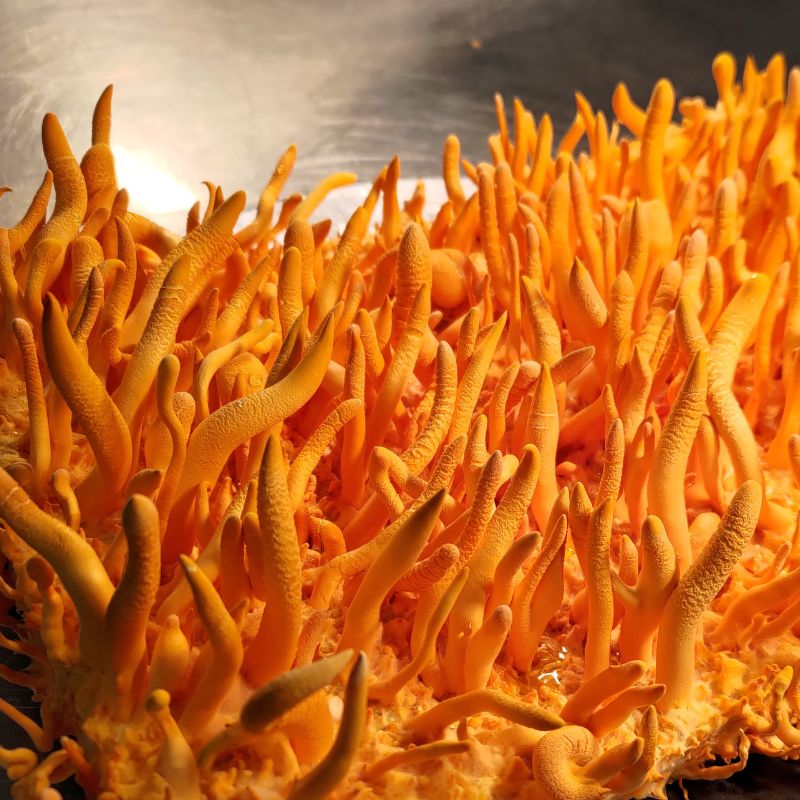 Świeże kordycepsy wyróżniają się delikatnie grzybowym smakiem, który z czasem przechodzi w nuty orzechowo-rzodkiewkowe o delikatnie wyczuwalnej słodyczy. Jędrna a zarazem krucha struktura zmienia się po obróbce termicznej, na teksturę zbliżoną do owoców morza. Kolor w trakcie smażenia/gotowania staje się jeszcze bardziej intensywny ( uwaga - kordycepsy intensywnie oddają kolor).
